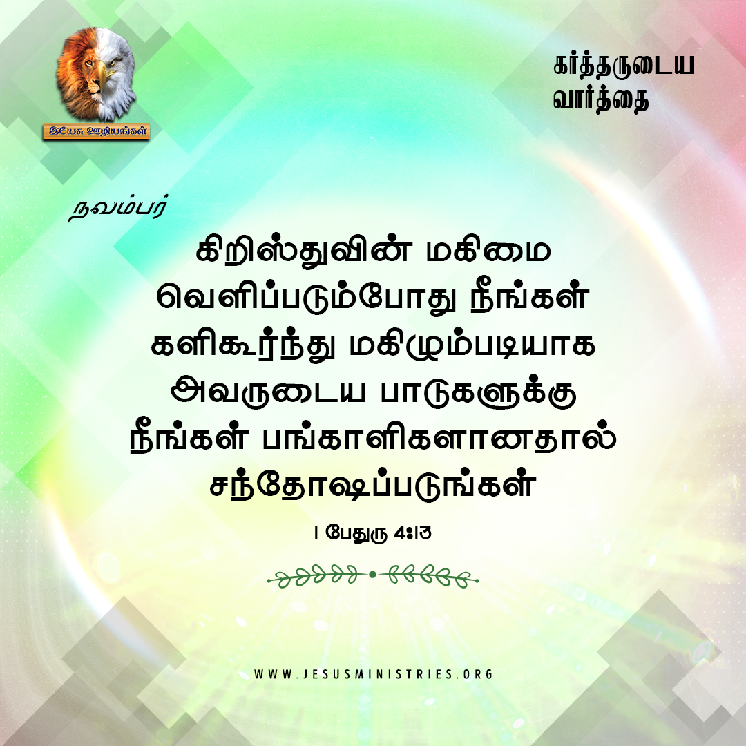 கிறிஸ்துவின் மகிமை வெளிப்படும்போது நீங்கள் களிகூர்ந்து மகிழும்படியாக அவருடைய பாடுகளுக்கு நீங்கள் பங்காளிகளானதால் சந்தோஷப்படுங்கள்.